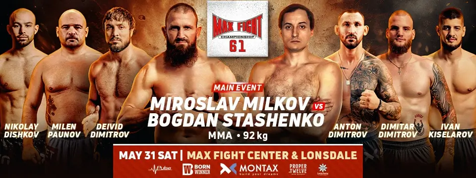 Главната среща на вечерта на MAX FIGHT 61 ще противопостави бургазлията Мирослав Милков „Спартанеца“ и варненския боец Богдан Сташенко в стил ММА, категория тежка.