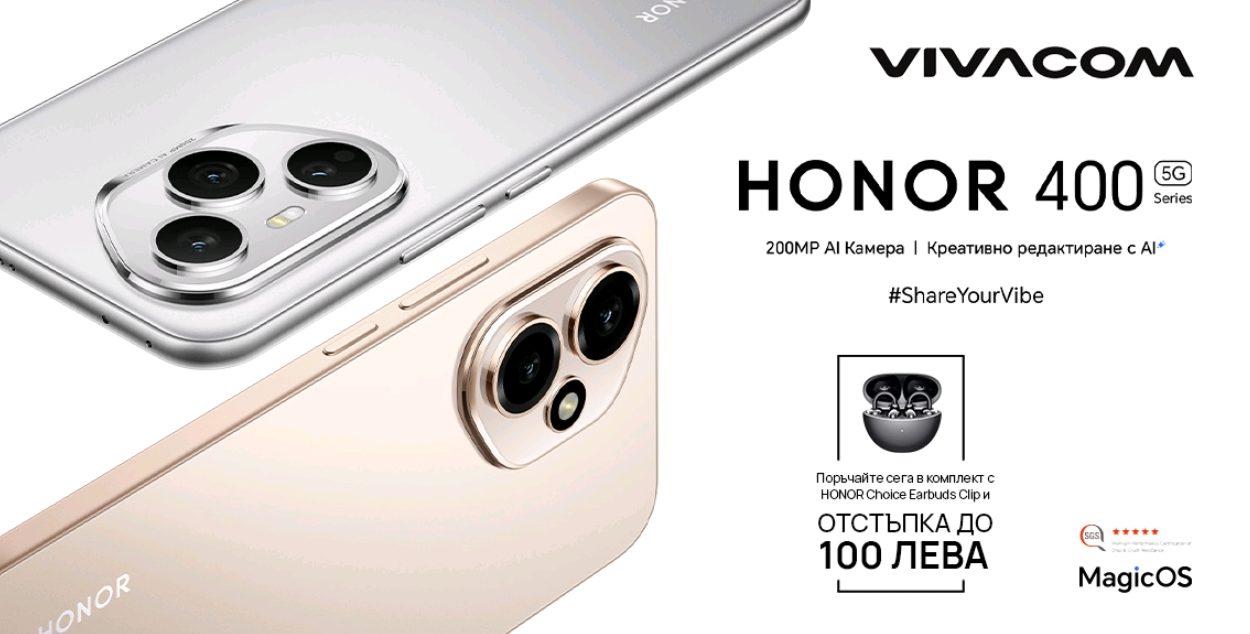 Vivacom обявява началото на продажбите на най-новите 5G смартфони от HONOR – HONOR 400 и HONOR 400 Pro, които вече са достъпни в търговската мрежа и онлайн магазина на телекома. Новите устройства съчетават най-съвременните технологични решения с изключителен комфорт при ежедневна употреба, поставяйки грижата за потребителя на преден план. До 9 юни Vivacom предлага и двата смартфона в комплект с безжичните слушалки Honor Choice Earbuds Clip и с до 100 лева отстъпка при сключване на 24-месечен договор за всеки Unlimited план и на свободна продажба в цялата търговска мрежа.
