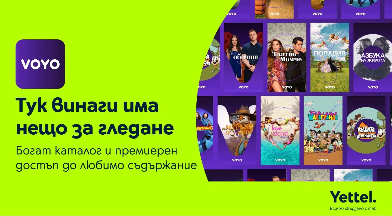 София, 17.06.2025 г. Yettel допълва палитрата от стрийминг услуги в портфолиото си, като добавя и онлайн видео платформата VOYO, част от bTV Media Group. От началото на юни тя е част от дигиталните и телевизионни услуги на оператора, и може да бъде активирана по следните начини: