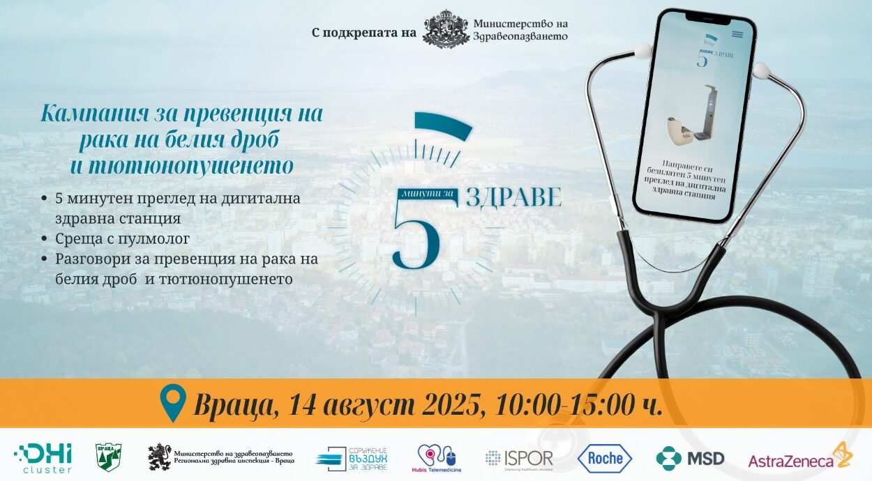 За втора поредна година ще се проведе кампанията „5 минути за здраве“ за безплатни изследвания чрез нови дигитални технологии, която започва от Враца на 14 август (четвъртък) 2025 г. от 10:00 до 15:00 ч. на ул. „Полковник Лукашов“ /срещу сградата на бившето кино „Коларов“/. Инициативата се организира от Българския клъстер за дигитални решения и иновации в здравеопазването с подкрепата на Министерството на здравеопазването, в партньорство със Сдружение „Въздух за здраве“, телемедицинската компания Хъбис, биотехнологичната фармацевтична компания Рош България и биофармацевтичните компании АстраЗенека и MSD, ISPOR Bulgarian Chapter, РЗИ Враца и община Враца.