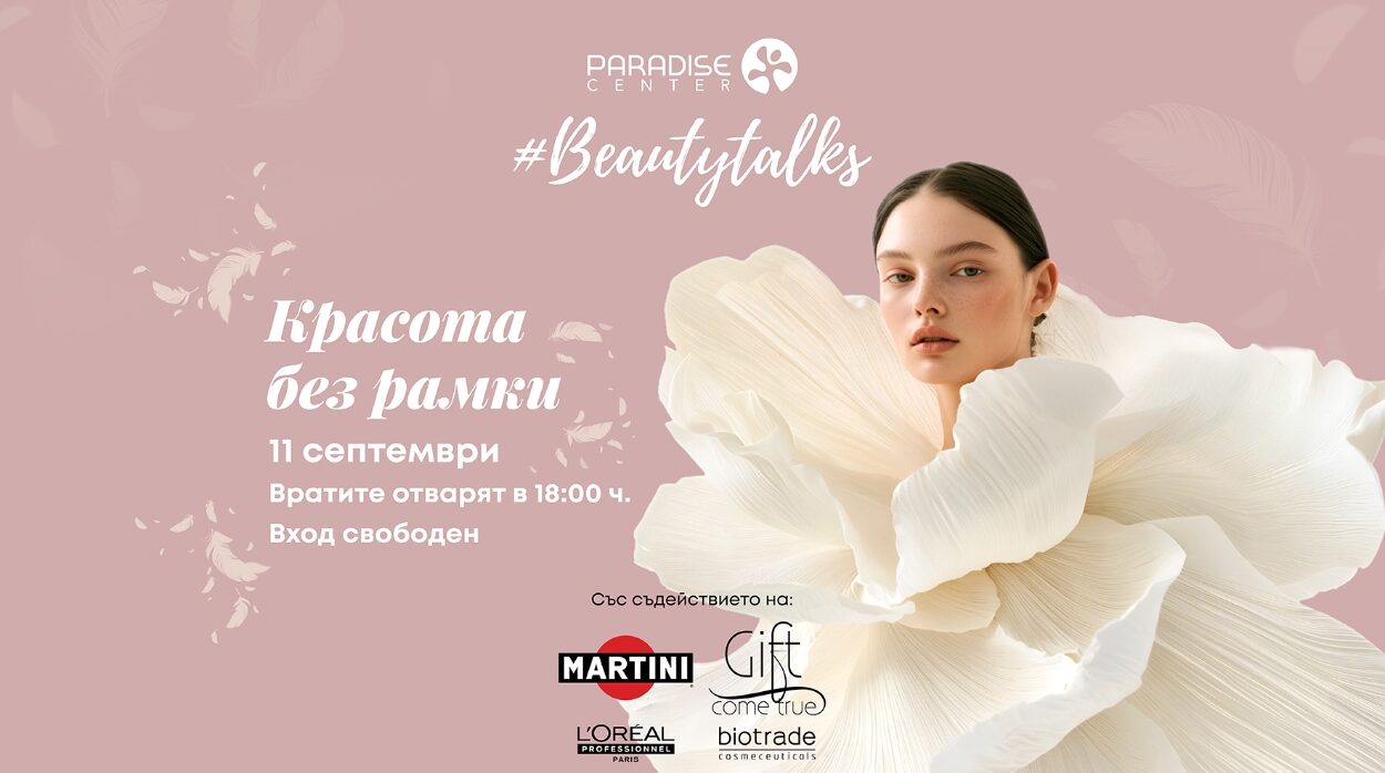Експерти в сферата на естетиката, психологията и модата ще говорят на първото издание на #BeautyTalks в Парадайс Център. „Кои са важните аспекти при избора на естетичен специалист и процедура?“, „Има ли изкуство в естетичната хирургия?“, „Как да избегнем бюти бърнаут?“ ще бъдат част от темите на събитието, което ще се проведе на 11 септември на откритата тераса (етаж +2) на търговския център и има за цел да създаде пространство за откровен и вдъхновяващ разговор за съвременните аспекти на красотата.