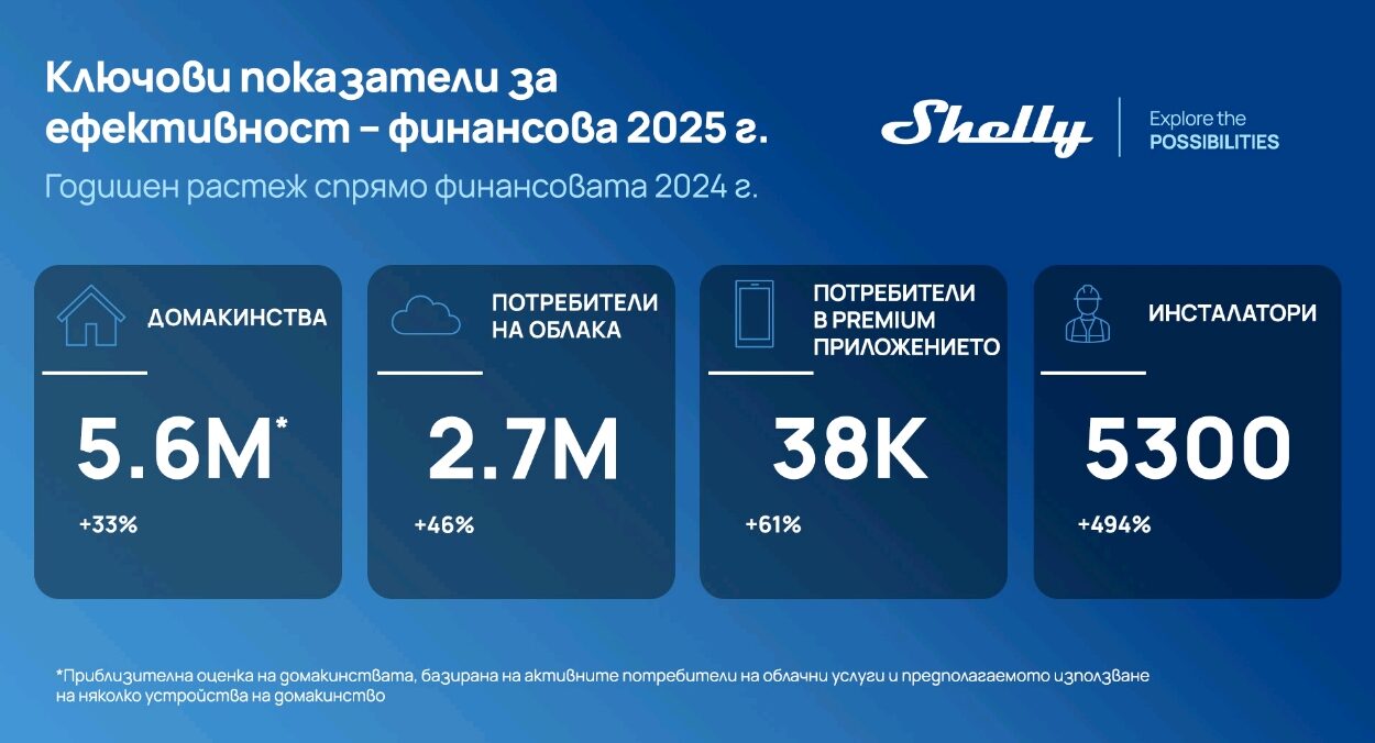 Броят на потребителите на Shelly Premium App се е увеличил с 61% на годишна база, което отразява нарастващото използване на разширените функционалности на платформата и постепенното преминаване към услуги с добавена стойност.